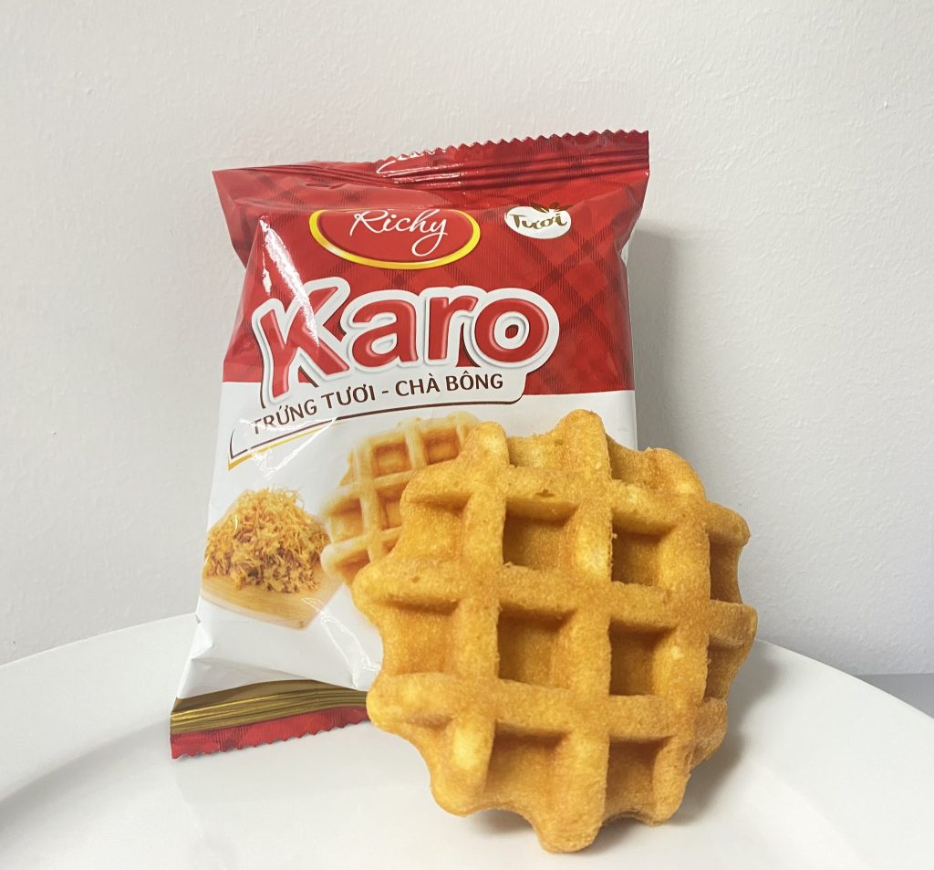 これはカロという鶏肉と新鮮な卵から作ったケーキです。カロの成分は卵22%、鶏肉21%を配合しているため、柔らかくて味が濃厚です。カロは2019年の発売以来大人気の商品で、全国の老舗菓子店、取次店、スーパーマーケットなどで販売されており、またベトナム航空の専用スナックとしても使われています。